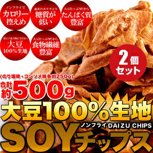糖質・たんぱく質・食物繊維を考えた!! 大豆100%生地SOYチップスです! お菓子は食べたい・・・ でもダイエット中・・・ 多くの方がこの悩みにぶつかるのではないでしょうか?? そこで夢のスナック登場! 糖質が低く、たんぱく質、食物繊維が豊富!! ノンフライでカロリーもOFF フレーバーも ・のり塩味 ・コンソメ味 の2種類セット♪